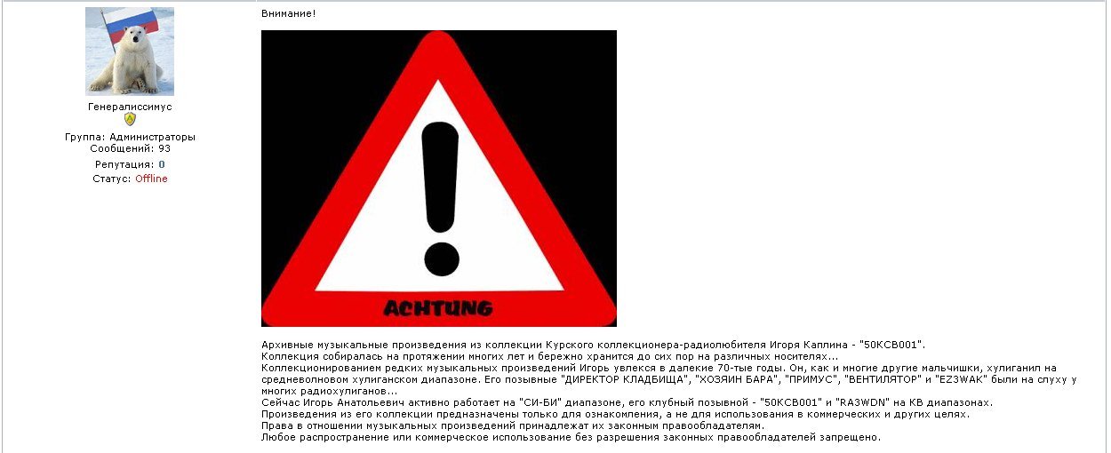 У нас все равны. Беседы лучше только по теме и реальные. Не приветствуется выкладка огрызков, типа у меня есть качество, но я вам не дам. Не приветствуется грубость и хамство. По-моему мы пришли туда куда надо. Правда, некоторым трудно сразу перестроиться. Откуда мы пришли я подробней напишу в альбоме Каширка, уже скоро. Пока мой план такой: 1.Сегодня Штрафные батальоны А.Берисона 2. Вдогон гитарник "Для Жоры Миргородского". хоть он и есть в сети, но звук, слушайте звук 3. Потом "Каширка" |